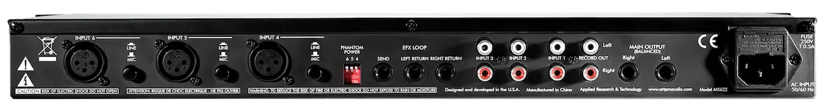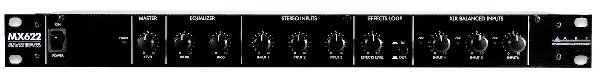 The MX622 is a versatile mixer combining three balanced microphone or line level inputs with three stereo line inputs into a single stereo line level mix. Essential features include external effects loop (mono send with stereo return), independent stereo record outputs, stereo TRS 1/4-inch balanced outputs and full range master two-band equalizer. The internal power supply and single rack-space 19-inch rack mount format allows for easy installation and reliable long-term operation.