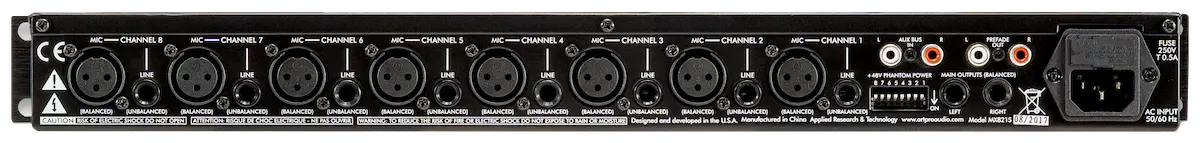 The ART MX821S may be used on stage, in the studio, or for permanent install applications including conference rooms, corporate boardrooms, churches, restaurants, small clubs, health clubs and more. A built-in power supply and single high 19-inch rack mount format allows for easy installation and reliable long-term operation.