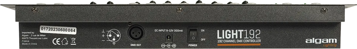The LIGHT 192 is a DMX console for personalized remote control of your led projectors, moving heads, lasers or smoke machines. With its 192 channels for controlling an installation of up to 12 fixtures, this DMX console lets you realize all your lighting ideas through its 16 available channels per fixture. A perfect ally for your parties, the LIGHT 192 also features 30 banks of 8 programmable scenes, for a total of 240 memorized scenes, 6 chase programs with adjustable speed and fade time, and 8 faders for precise control of your setting preferences. Finally, this console comes in a rack-mountable 19" format for perfect integration into your setup.
