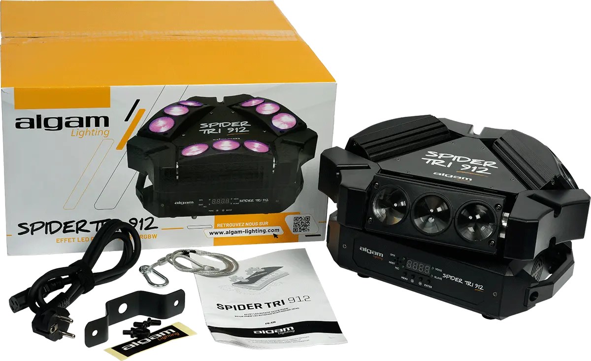 The SPIDER TRI 912 is the ideal dynamic LED lighting system suitable for discos, concerts, and private events. It is easy to install and can be set up in various ways, such as being placed on the floor or suspended upside down. The system consists of three motorized mini-bars that can be adjusted in tilt and each contains three independently adjustable 12W RGBW LEDs. The three mini-bars are cleverly arranged in a triangle shape and are mounted on a motorized axis, enabling quick 360° rotation and impressive beam sweeps, creating a vibrant atmosphere on the dance floor. The lighting system offers built-in automatic and music detection modes for users who prefer a quick setup without having to make tedious adjustments. Additionally, more advanced users can utilize the DMX mode to program their light show precisely.