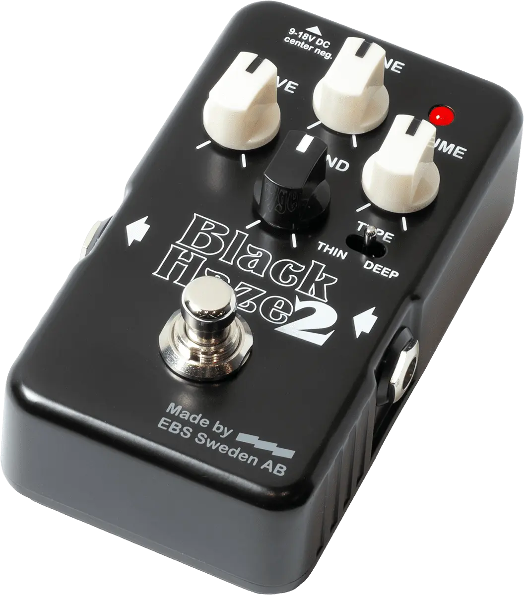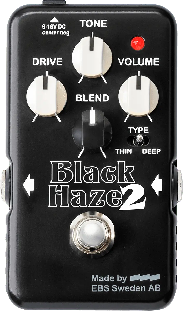 Three different Drive types. Experience a world of sonic possibilities with three different types of drive engines. Choose between a Deep low-end fuzzy drive or a more gnarly overdrive with Normal selected. The Thin position adds tightness and presence. Blend clean and drive signal The new Blend control lets you precisely determine the perfect balance between your clean signal and the gripping drive. We've included a convenient Gain adjustment pot inside the pedal, ensuring you can compensate for the volume if you experience a drop in level at your desired mix setting. The Black Haze 2 runs on 9V DC but can be powered by up to 18V DC for enhanced headroom. The Black Haze 2 is created with the bass player in mind but is also suitable for guitar.