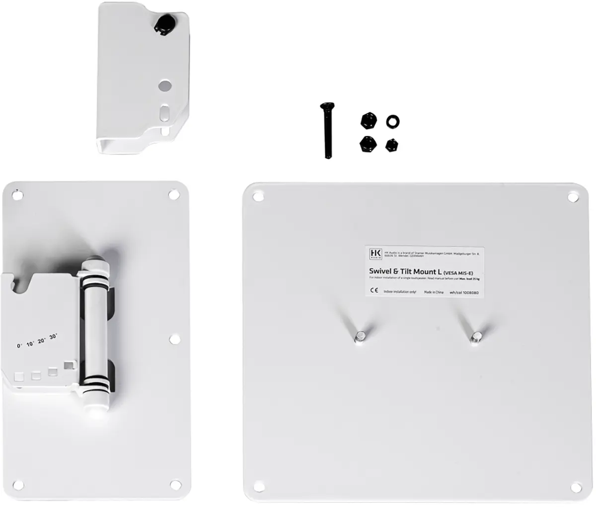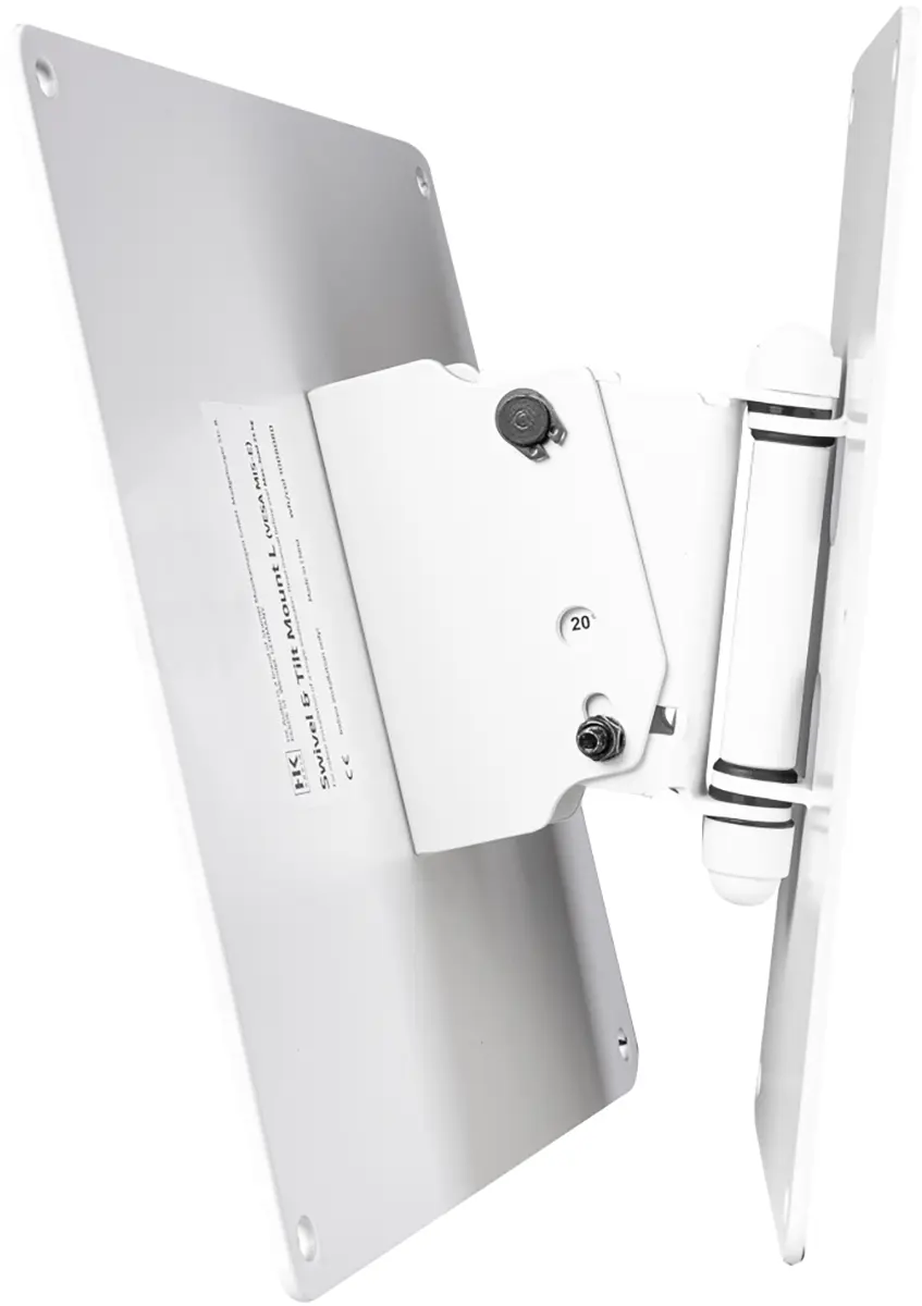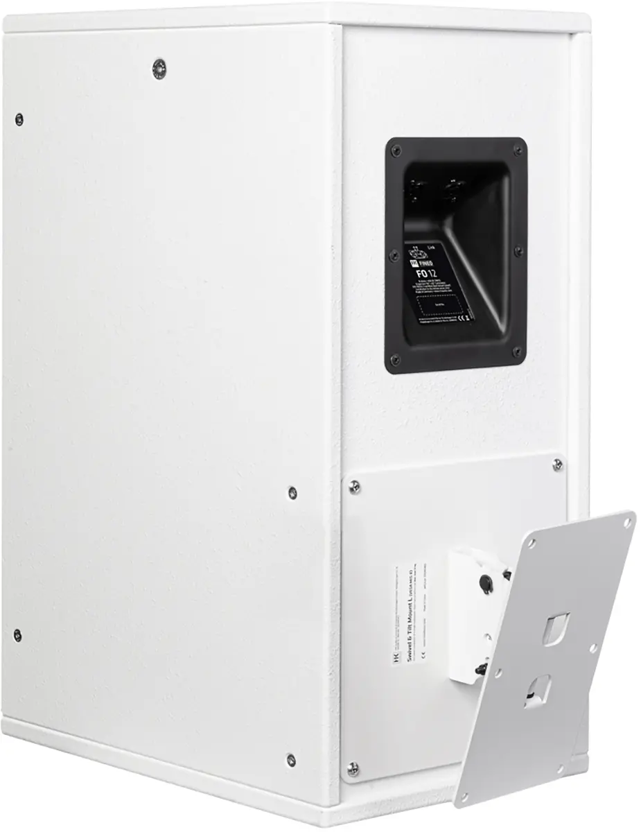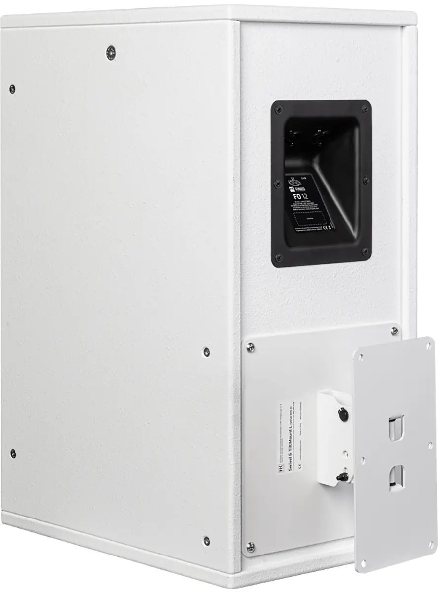 The swivel and tilt wall bracket L is used to mount a FO12 or FO15 speaker on a wall. The bracket allows the speaker to be rotated continuously horizontally and tilted vertically in 10° increments from 0° to 30°. The swivel and tilt wall mount L is attached via the VESA hole pattern (MIS-E) on the back of the cabinet.