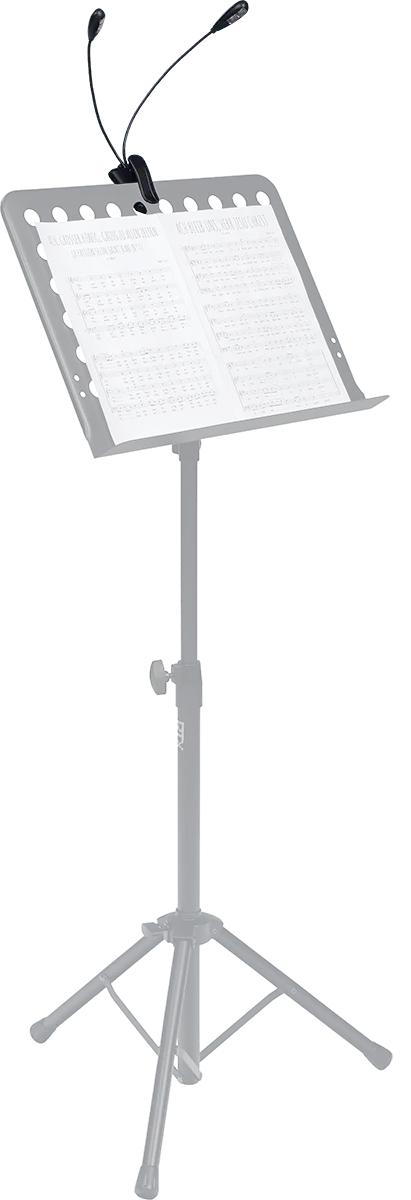 Need more light on stage because you're working with broader parts? Have a look at the RTX LP2L music stand lamp. It's equipped with two flexible goosenecks, each of which is fitted with a pair of LEDs that can be toggled at will and pointed at your pages at any angle. What's also great is that L2PL runs on batteries (3x AAA, included) which means you'll never have to move your stand or lectern closer to a power socket ever again.