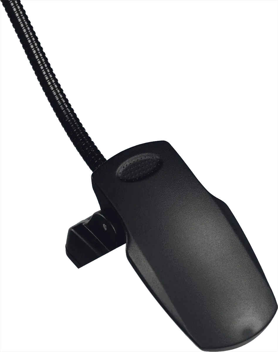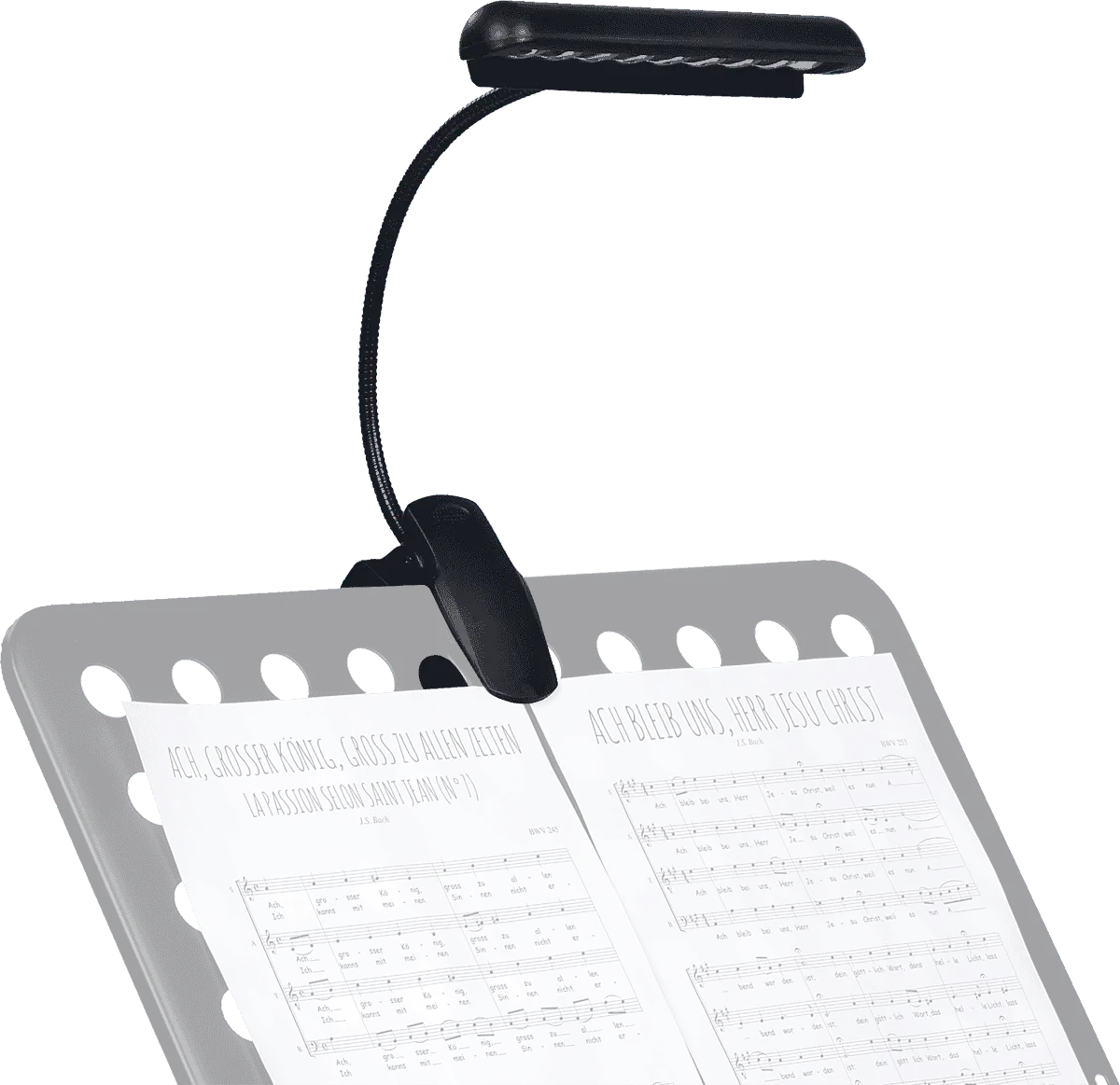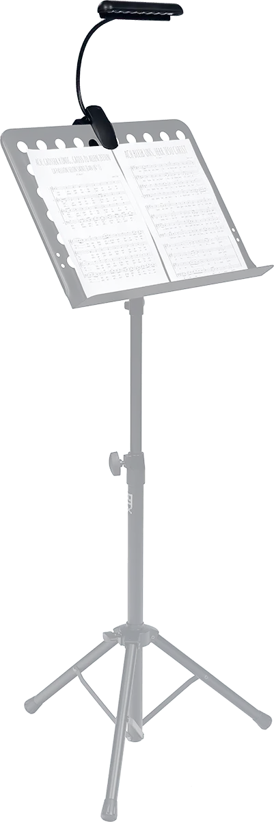 The extra-broad RTX LPL music stand lamp has a row of nine LED bulbs that shed clear light over a wide surface, and is easily positioned via the flexible gooseneck mount. This elegant lamp iS simply clipped onto the upper edge of the music rest and powered using the three included AAA batteries.