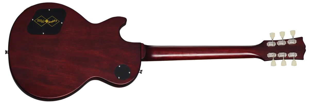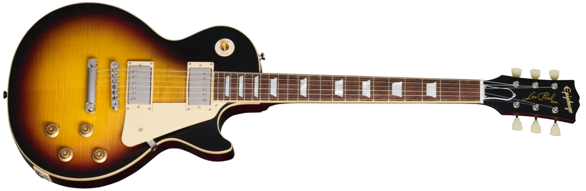 Made in collaboration with the Gibson™ Custom Shop, the Epiphone 1959 Les Paul™ Standard is Epiphone's incredible recreation of the rare vintage classic, updated to be more authentic and true to the originals than ever. It features a mahogany body with a maple top with a AAA flame maple veneer, a one-piece mahogany neck with a comfortable '59 rounded, medium C profile, long neck tenon, and Gibson-style "open book" R9 headstock shape, VOS (Vintage Original Sheen) finish, Gibson Custombucker humbucking pickups, Switchcraft® selector switch and 1/4" output jack, CTS® pots, 50s era wiring, Mallory™ capacitors, non-beveled pickguard, Epiphone Deluxe vintage tuners with Keystone buttons, and a vintage-style brown and pink hardshell case. Play one today, and prepare to be amazed!