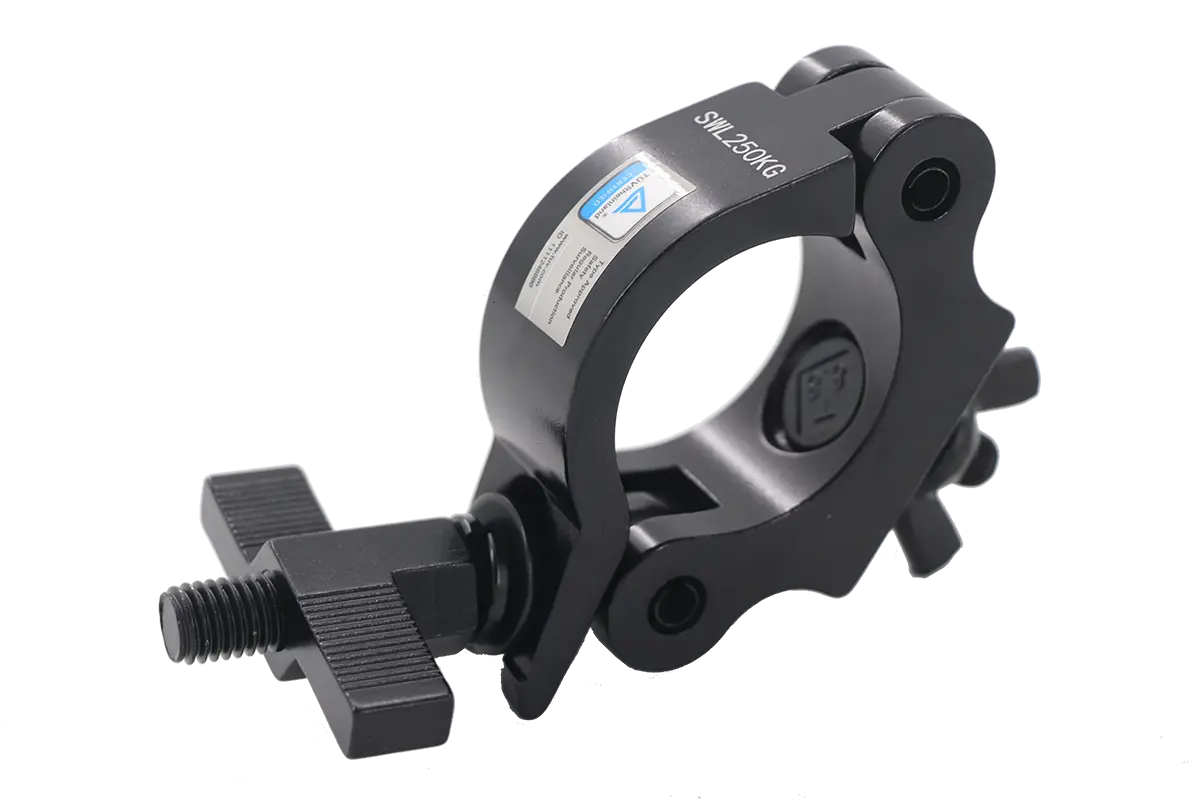 The HCB-4252-250KG is an aluminum half coupler for tubes mounting, ideal for installation and contractors. Designed to hook onto truss with cross-sections from 42 to 52 mm, this half coupler has a maximum load capacity of 250 kg.