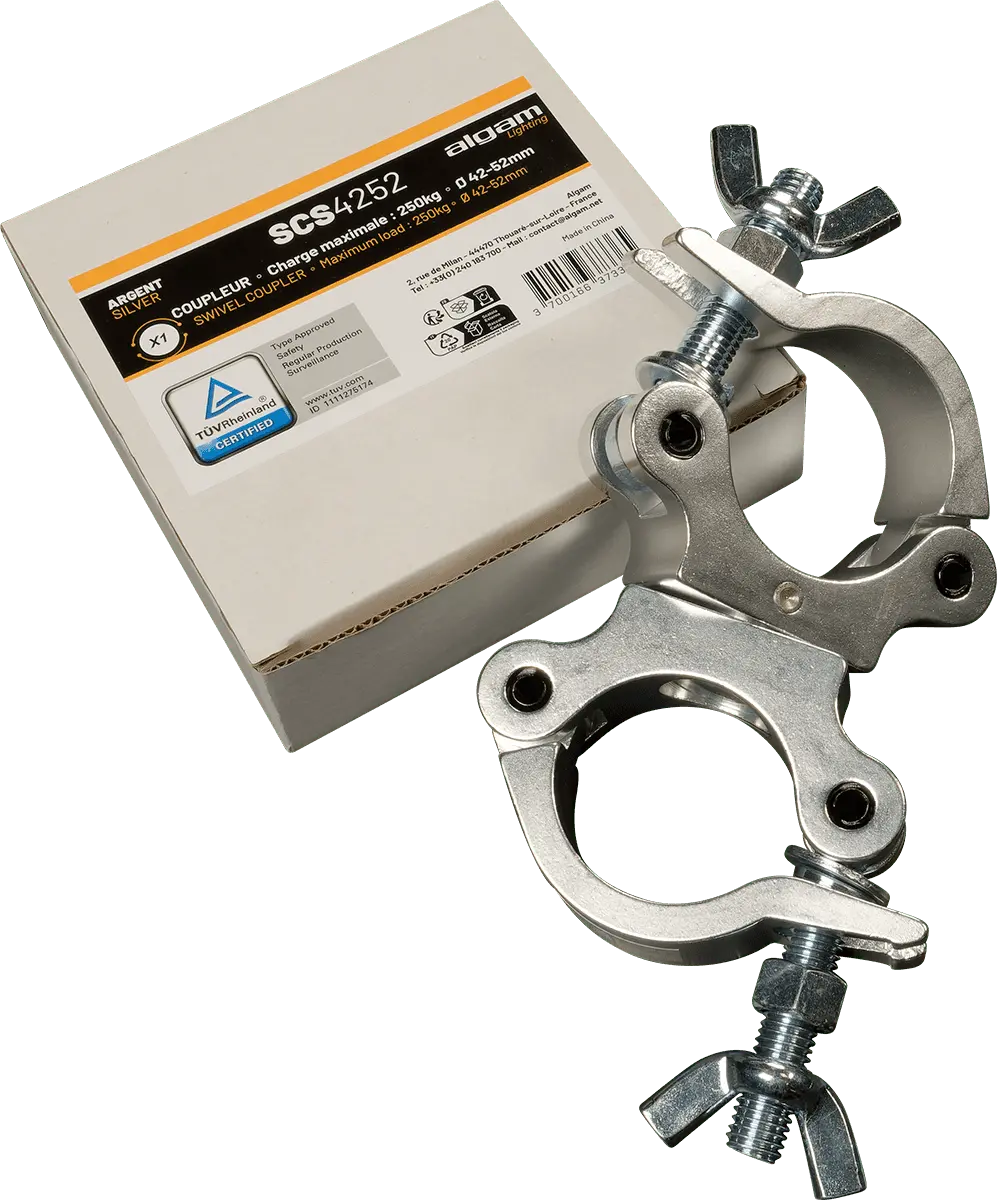 The SCS-4252-250KG is an aluminium coupler for structures, ideal for services and installations. Designed to attach to structures with cross-sections from 42 to 52 mm, this coupler has a maximum load capacity of 250 kg and a 360° rotating pivot.