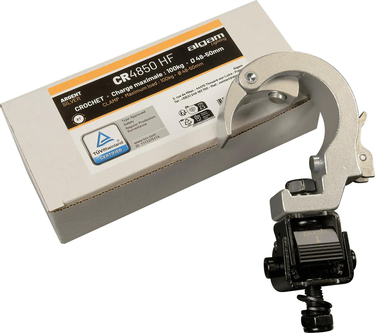 The CR-4850-HF is an aluminium clamp for structures, ideal for services and installations. Designed to hook onto structures with cross-sections of 48 to 50 mm, this hook has a maximum load capacity of 100 kg and a 90° swivel joint.