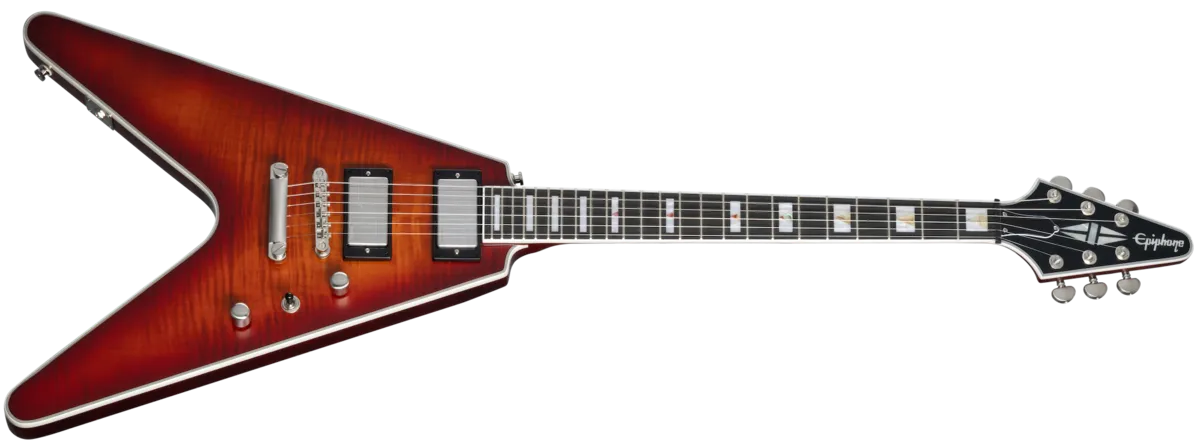 The newly reimagined Epiphone Prophecy collection features iconic Inspired by Gibson ™ body shapes with a modern twist for players seeking to break tradition and set new standards in speed, sound, and technique. Front-and-center is a pair of custom-voiced Fishman Fluence® pickups that deliver three distinct tones a warm "Patent Applied For" vintage humbucker™, hot modern humbucker, and a shimmering, optimized single-coil sound, all accessed by push/pull Volume and Tone pots. The Flying VT Prophecy also includes Grover® locking Rotomatic® tuners, Epiphone's Lock Tone ™ Tune-O-Matic™ bridge and tailpiece for added sustain, a Graph Tech® NuBone® nut that boosts harmonic content and increases tuning stability, custom binding, ebony fretboard, jumbo frets, PosiLok strap buttons, and an asymmetrical SlimTaper™ neck for comfort and speed. A premium gig bag is included.
