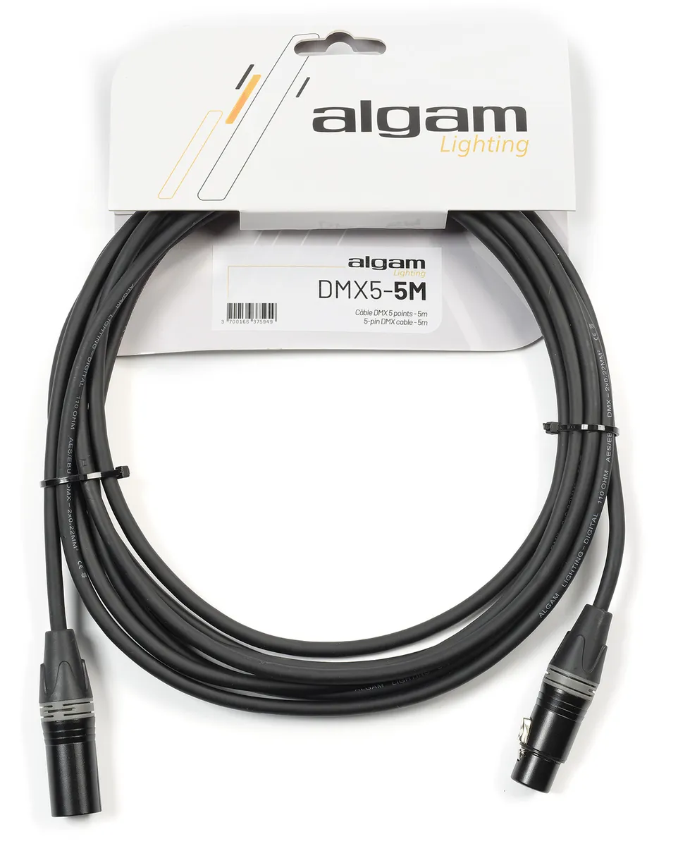 This 5m 5-pin DMX cable developed by Algam Lighting is the ideal solution for connecting your DMX console to your lighting machines, or for creating chains between machines on a stage or structure. Robust and reliable, it guarantees optimum DMX signal transmission thanks to its 110Ω impedance, while its 5-point connection makes it ideal for professional lighting systems.