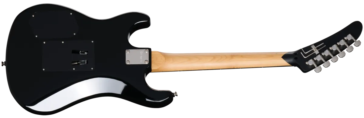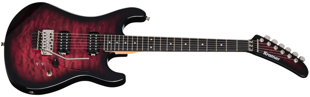 The Kramer 84 HH Quilt is an updated version of the legendary Kramer 84. While it has expanded features, we've kept all of the Made to Rock Hard Kramer attitude of the originals. The Kramer 84 HH Quilt is outfitted with an alder body with a gorgeous AAAA quilt maple veneer top. The body is equipped with a Floyd Rose® 1000 Series tremolo paired with an R2 locking nut for vibrato bar gymnastics without the worry of knocking things out of tune. The neck is a thermally aged bolt-on hard maple neck with a satin finish and an ebony fretboard that has 22 jumbo frets and pearloid dot inlays. The neck has a Kramer Slim Taper ™ C profile that is thin and fast, so it is ideal for shredding. The fretboard features a compound radius that is 10" at the nut and flattens out to 14" further up, so playing first-position chords is easy while allowing you to play deep string bends further up the neck without the notes fretting out. The dual-action truss rod is adjusted with a spoke wheel-style truss rod adjustment nut, which is positioned at the end of the fretboard for unfettered access. The body's gloss finish is duplicated on the front of the 84 non-angled big banana headstock, and the front of the headstock has a matching quilt maple veneer. The 84 HH Quilt's headstock has a classic Kramer logo, is fitted with die-cast tuning machines, a nickel string retaining bar, and has a wrench holder for the Floyd Rose on the rear, so you'll always have the tools to adjust the tremolo on hand. The updated electronics feature a pair of Kramer USA-made Eruption pickups that were designed by Gibson Master Luthier Jim DeCola. Instead of having mounting rings, the pickups are screwed directly into the body for enhanced sustain. A 3-way toggle pickup selector switch allows you to use each pickup by itself or together, and two mini toggle switches (one for each pickup) are provided for coil splitting, giving you a choice of humbucker™ and single coil tones that you can combine at will. A single master volume control with a retro-style black knurled knob controls the overall volume level of both pickups simultaneously, making it easy to crank things up for your awe-inspiring solos. A Kramer premium gig bag iS included with the Kramer 84 HH Quilt to keep this Made to Rock Hard shredder safe when you're traveling to your next gig.