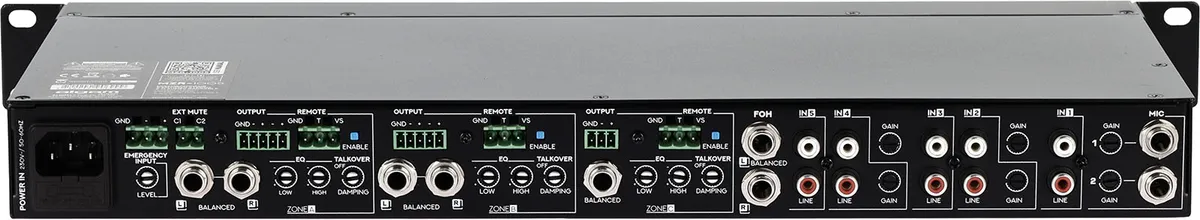 - Zone controls (rear panel): 2-band equalization, talkover attenuation level adjustment, Eurobloc input for remote volume control