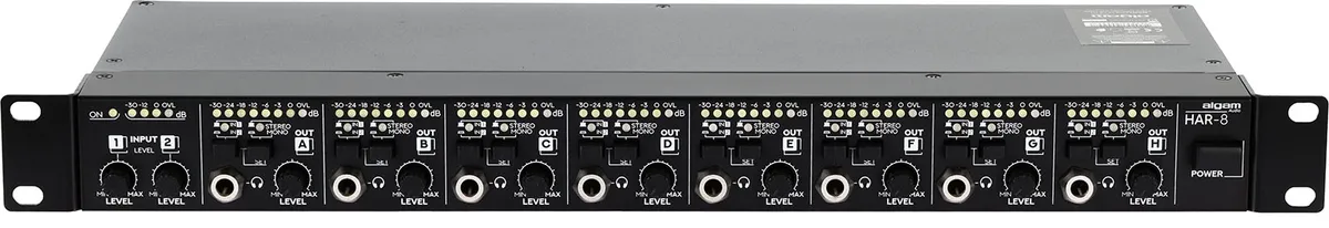 The HAR-8 is designed to be easy to use, even in the most demanding working environments. It features a clear, intuitive interface, with easily accessible control buttons on the front panel. Each headphone output has its own dedicated source selector, a mono/stereo switch to convert the output signal to stereo if required, and an 8-segment LED VU meter, graduated from -30 to 0 dB, for continuous monitoring of each channel's output level.